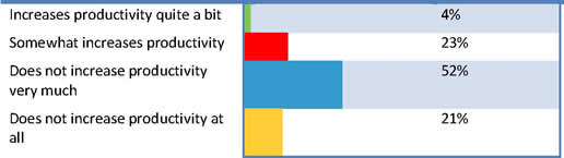 More than 3 in 4 believe that social media hurts employee productivity, yet they have no way of knowing by how much; two-thirds of respondents (65%) don’t have a way to measure employee productivity while on the computer. Yet more than half (54%) felt social media was useful for employees to perform their duties.